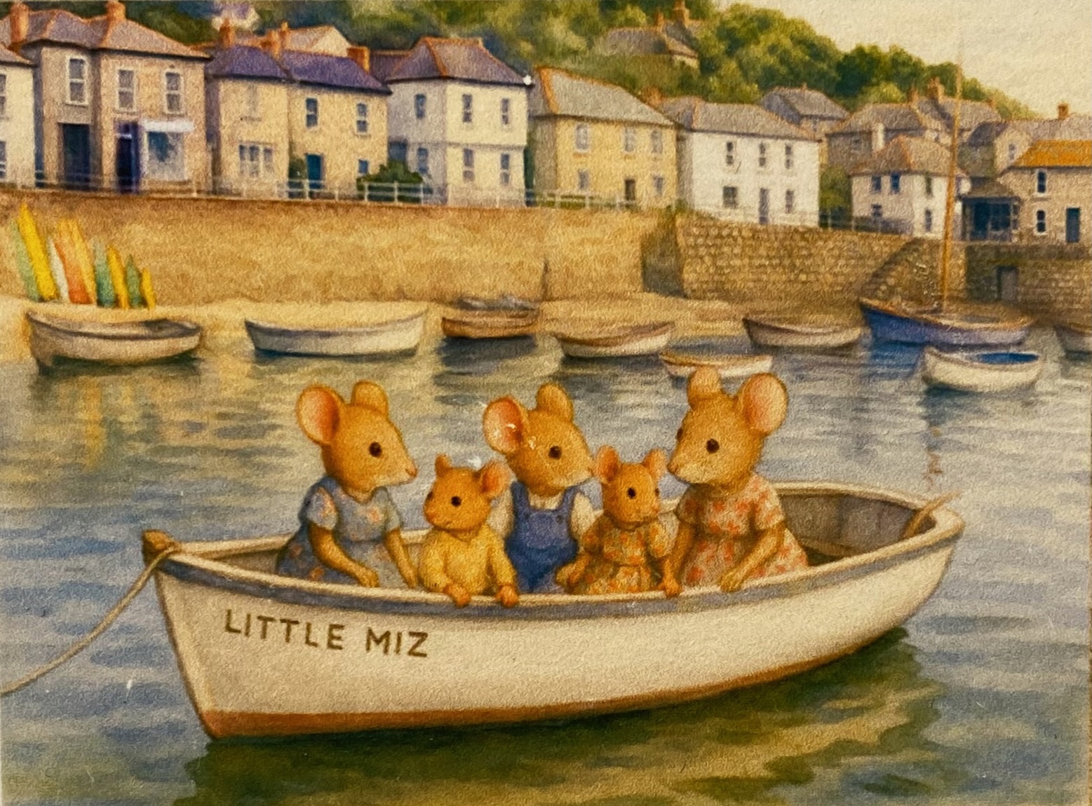 This lovely miniature piece of Art shows Mr and Mrs Mouse and their children on their Boat Little Miz, in Mousehole Harbour.  Each one comes in its own box.