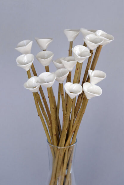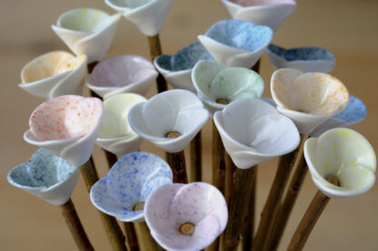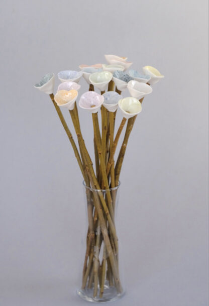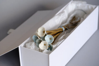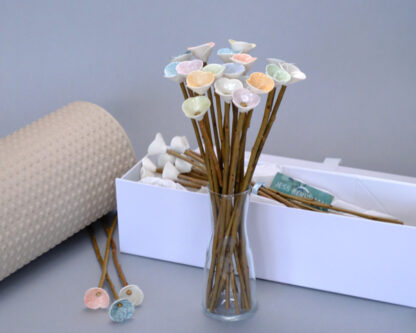 Bunch of porcelain mini flowers on natural willow stems, with glass vase and gift box. These are available in 9 or 18 flower bunches and you can have plain, mixed or choose your own colours. Please note if these are made to order allow 14 days. We will confirm once you’ve placed your order if they are in stock and being despatched straight away or being made to order.