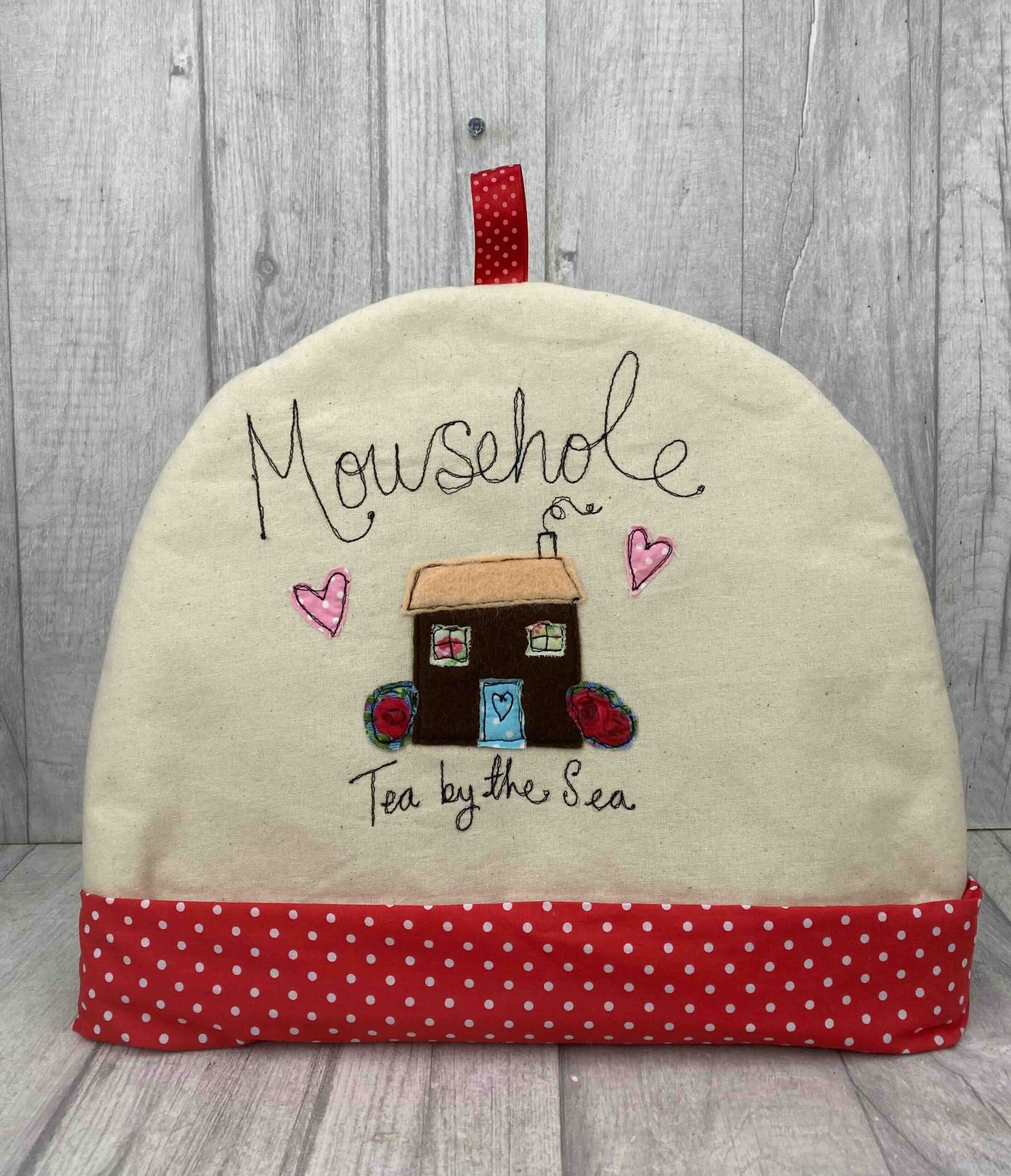 This lovely large handmade Tea Cosy features a Cornish cottage with a red and white spotted  band at bottom.  Personalised as Mousehole, but if you wish to have another personalisation of a place or person please put this in the  notes at checkout and we will arrange this with the Artist for you.