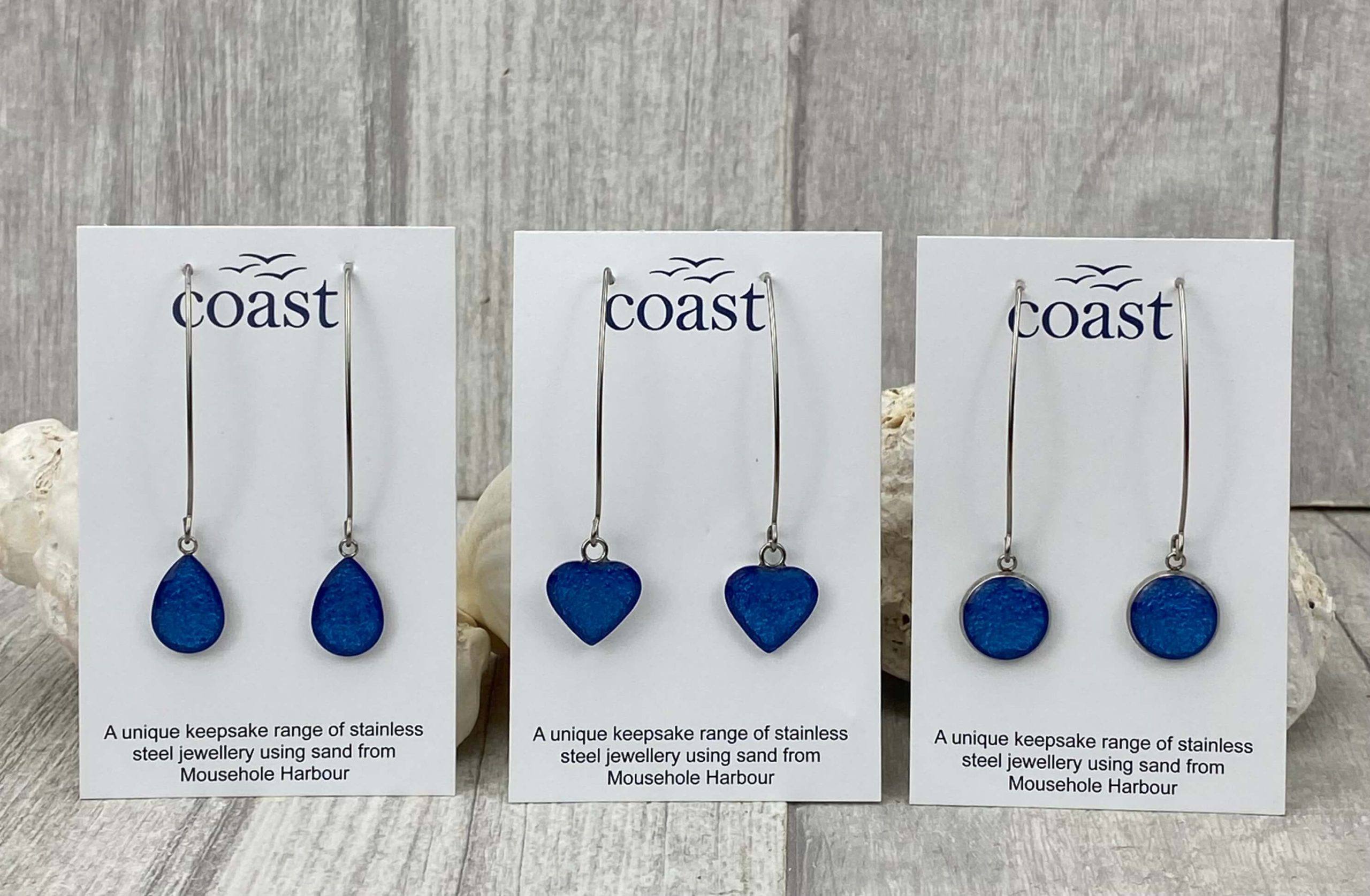 These beautiful handmade Cornish earrings are made with hypoallergenic stainless steel. They contain sand from our beautiful harbour here in Mousehole and are mixed with resin – making them an extra special gift for someone…. or yourself!