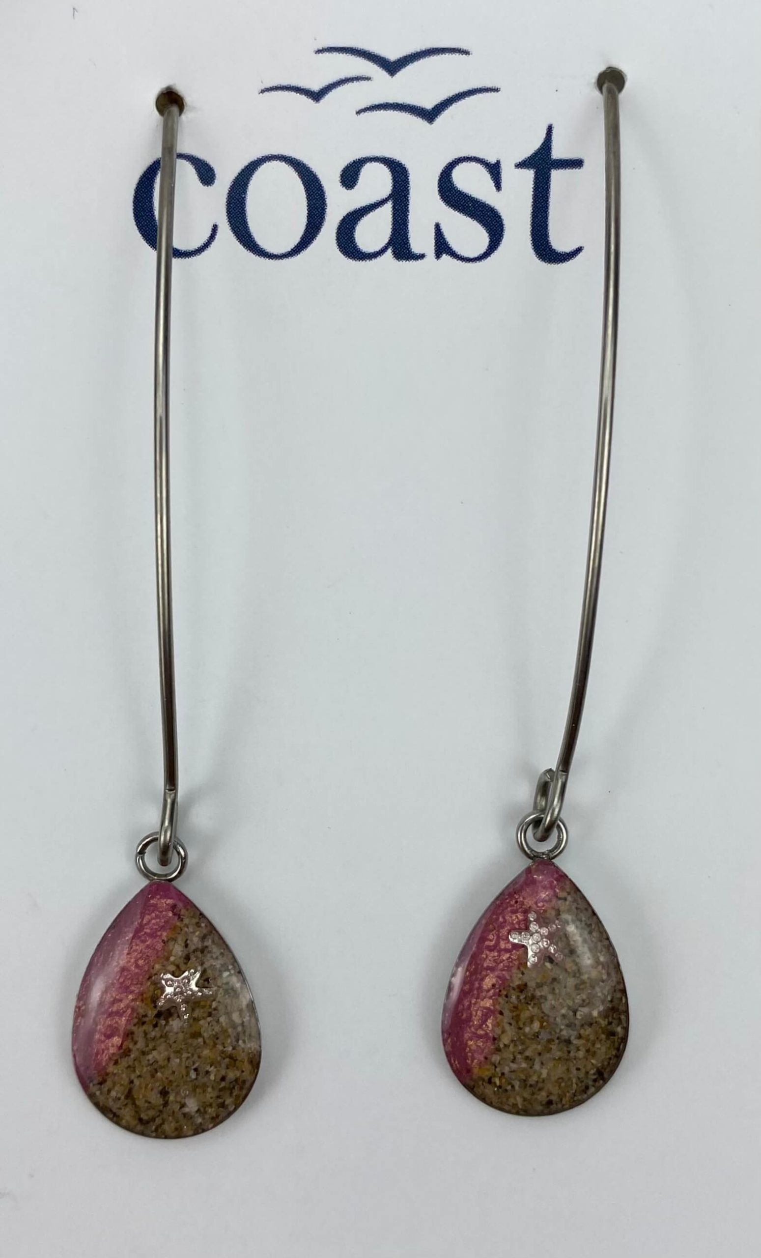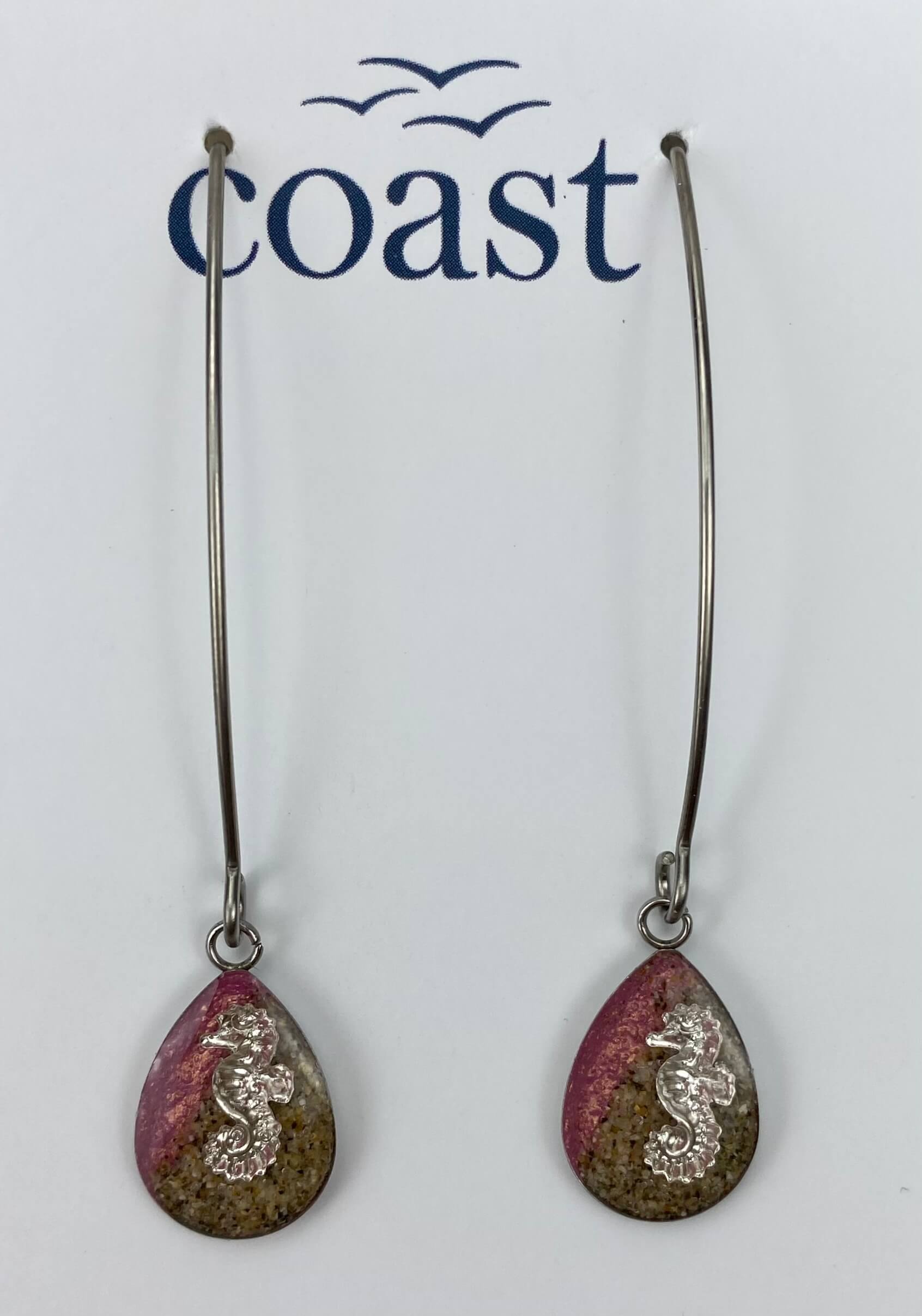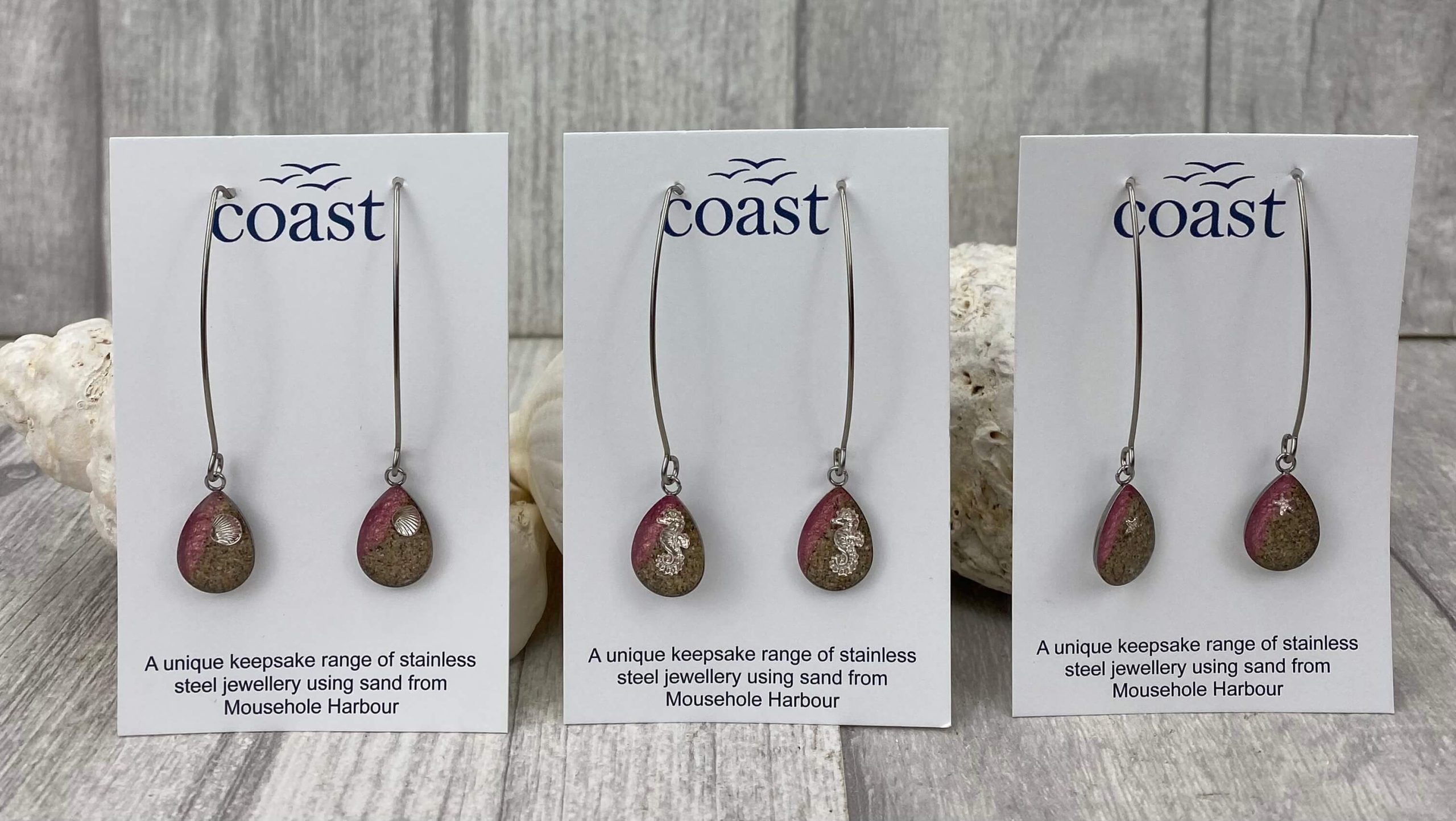 These beautiful handmade Cornish earrings are made with hypoallergenic stainless steel.  They contain sand from our beautiful harbour here in Mousehole and are mixed with resin – making them an extra special gift for someone…. or yourself!