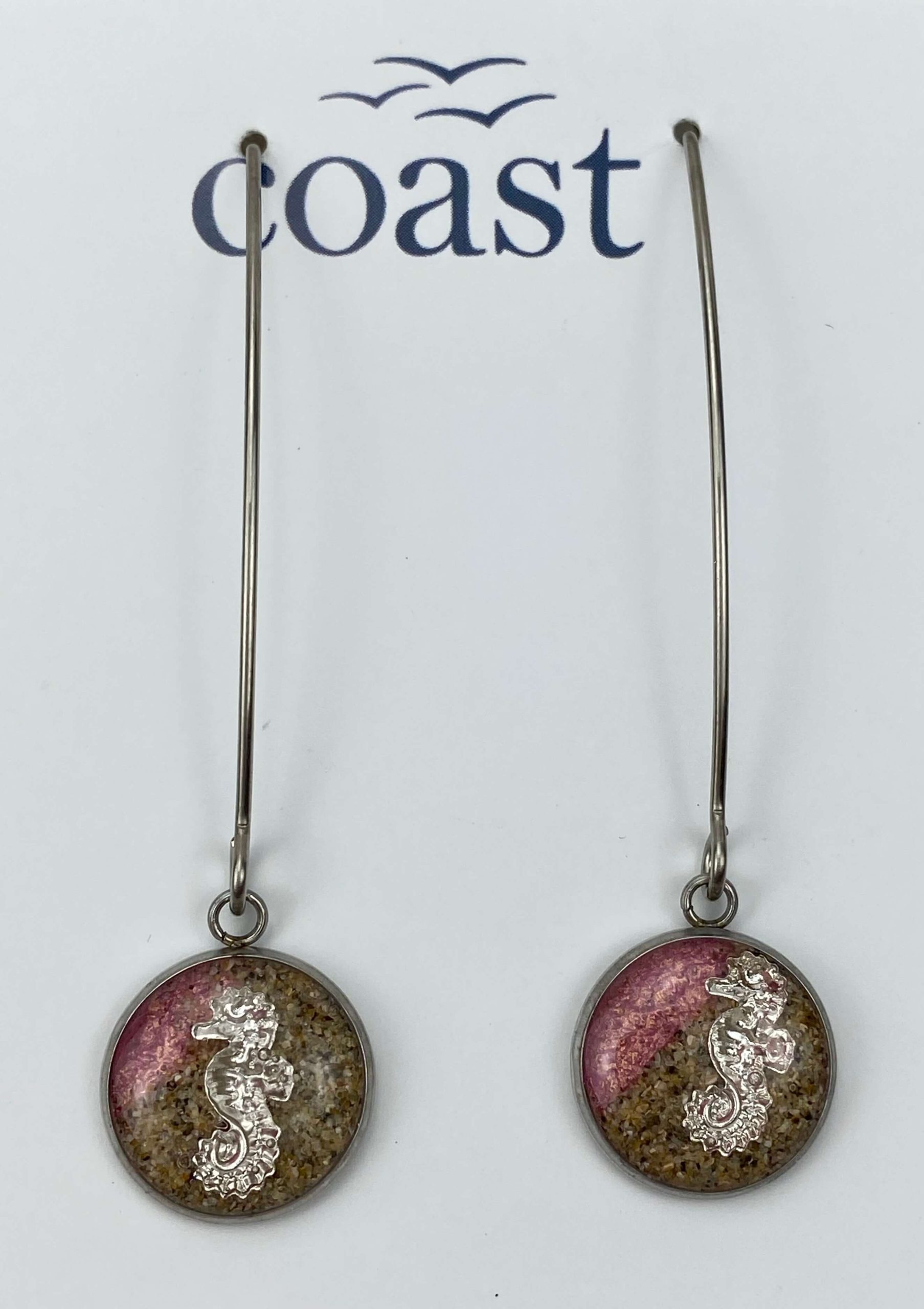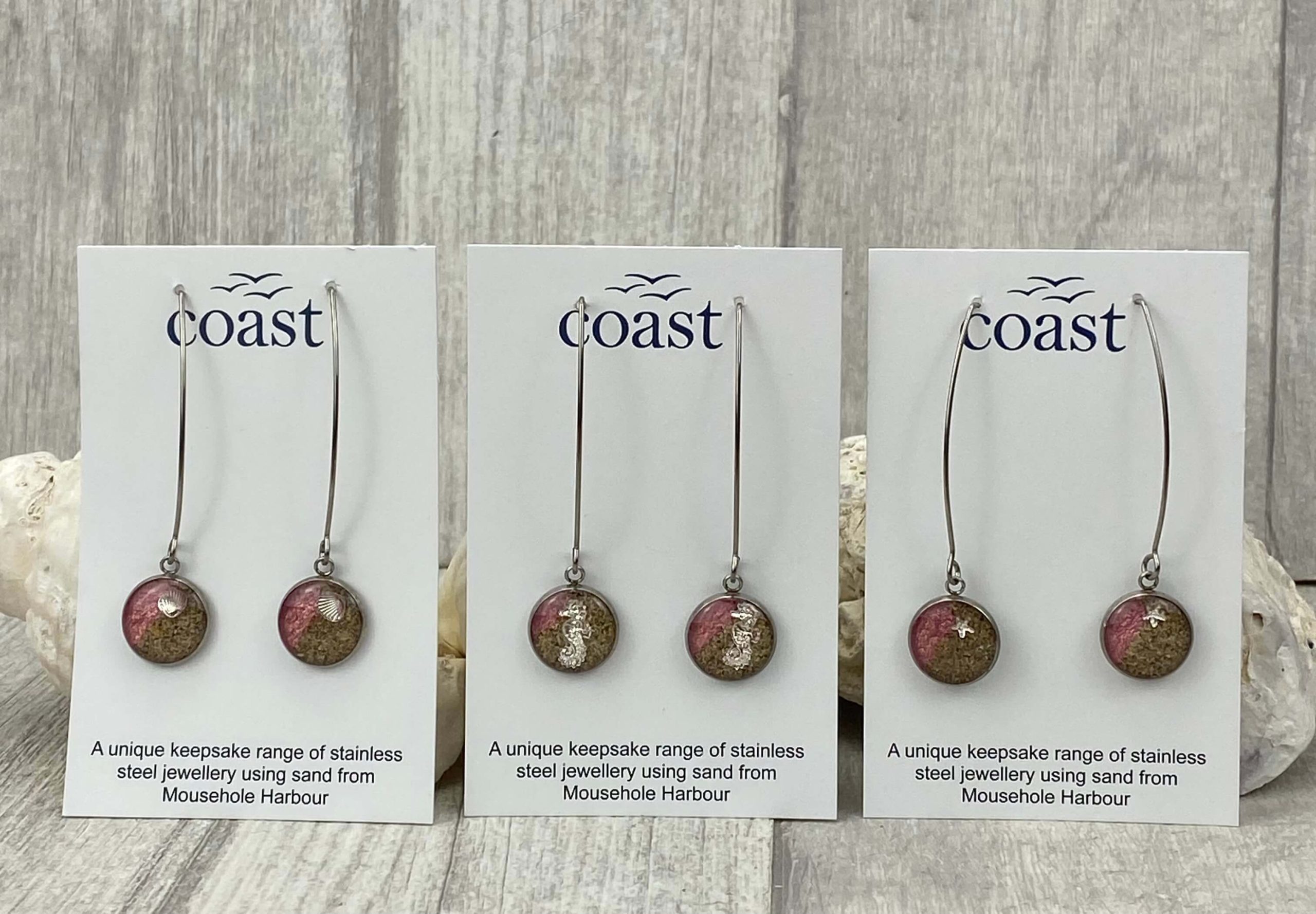 These beautiful handmade Cornish earrings are made with hypoallergenic stainless steel.  They contain sand from our beautiful harbour here in Mousehole and are mixed with resin – making them an extra special gift for someone…. or yourself!