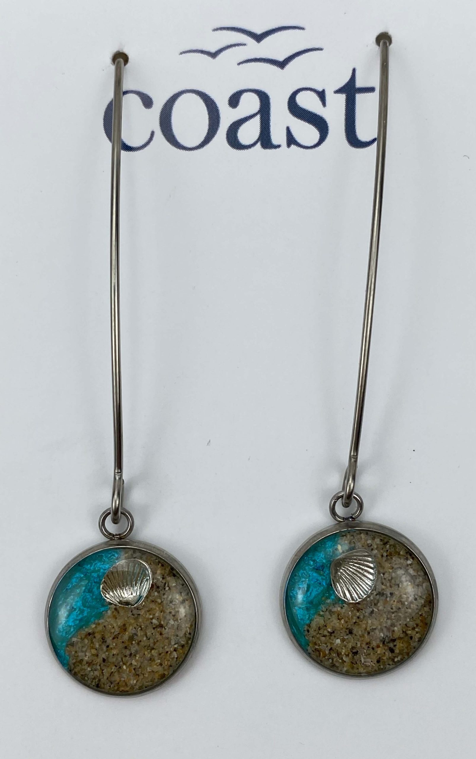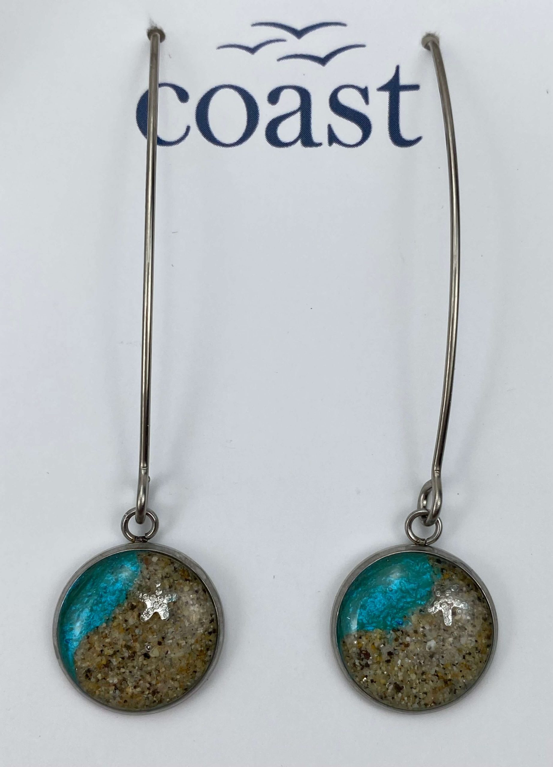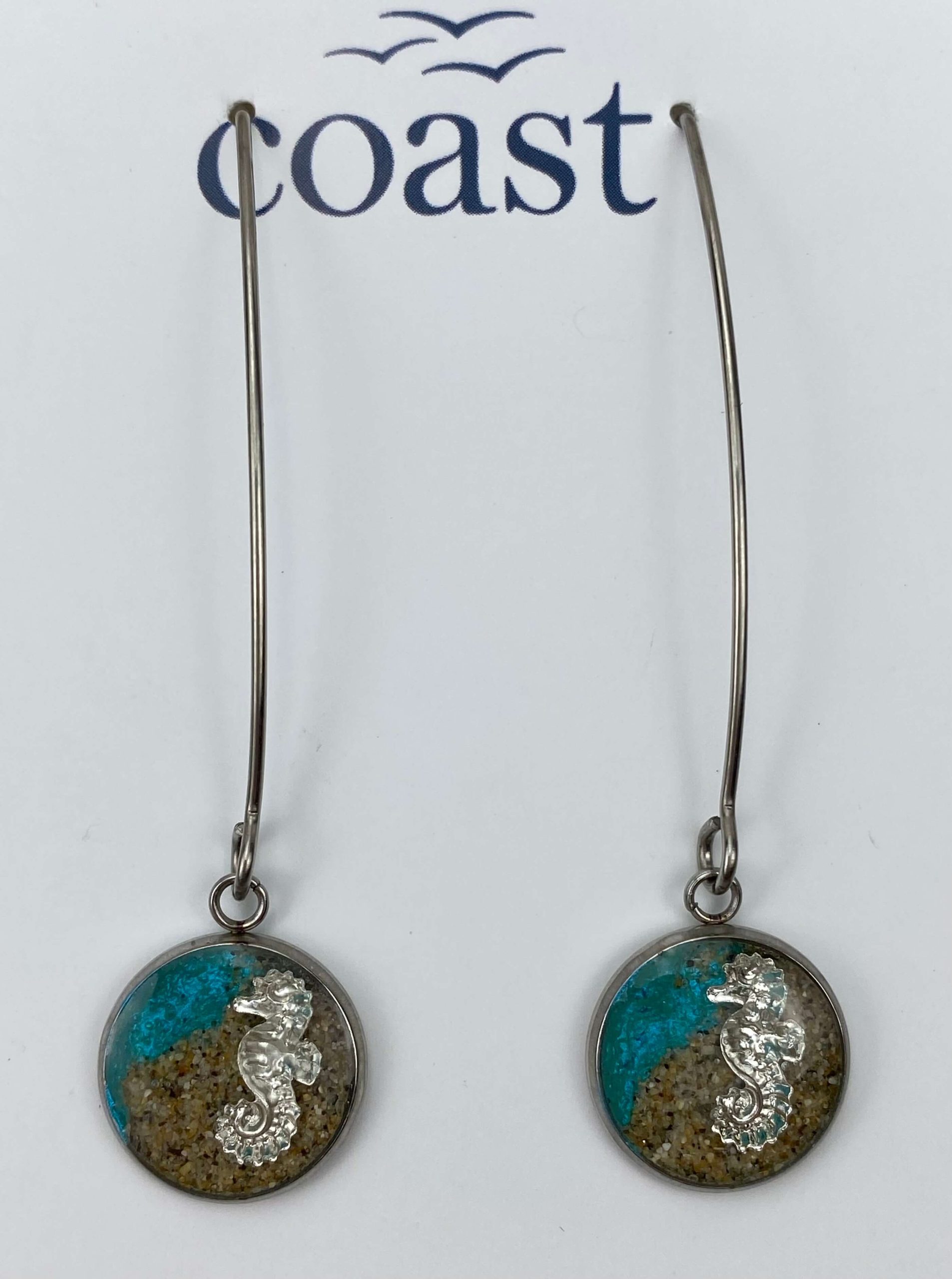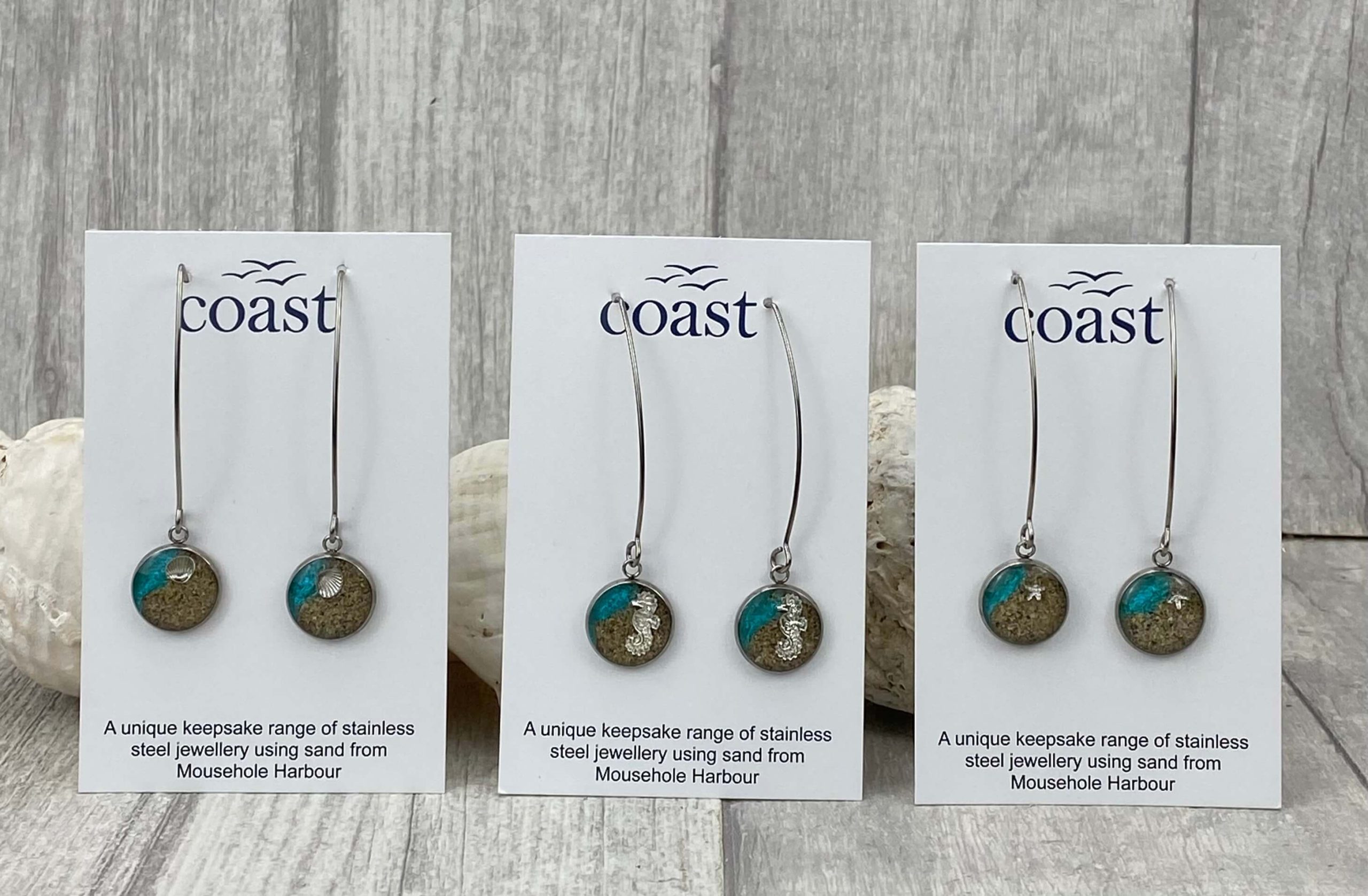 These beautiful handmade Cornish earrings are made with hypoallergenic stainless steel.  They contain sand from our beautiful harbour here in Mousehole and are mixed with resin – making them an extra special gift for someone…. or yourself!